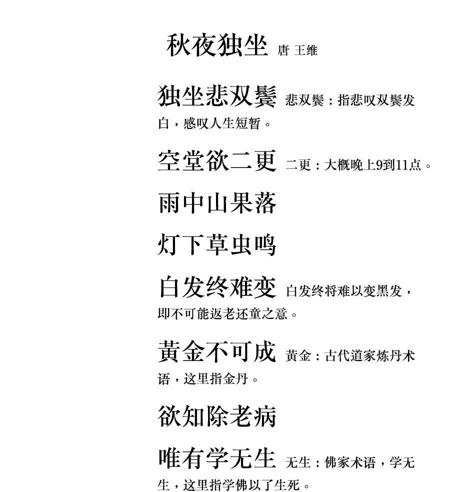 王维信佛,他的诗歌常常给人以空灵和宁静的感受。诗歌一开始便以“悲双鬓”发出岁月催人老的感叹,接着便从悲字展开:空堂静坐,不知不觉又到了二更天。时间在无情地流逝,我又能如何?此时,唯有放下心中一切顾虑和负担,身心与周围打成一片:夜雨淅淅沥沥,此时听到野果雨中落下,草虫近处鸣叫。大自然种种声音,此时历历分明。颔联“雨中山果落 灯下草虫鸣”不仅描绘了独坐入静时种种声音生于耳根的情景,而且隐含着一死一生,生死交替,轮回不断的哲理。雨中山果落,寓意的是一物之终结,灯下草虫鸣,寓意的是一物之开始。如此一死一生,轮回不断,实在让人兴叹。为了解决人生这生死大事,自古就有佛家与道家两种不同的修炼。道家有内丹外丹之修,成功者可以长生不老;佛家则弃皮囊而求证不生不灭的彼岸。当然作者王维是信佛的,他认为,道家返老还童之术不可信——白发终难变 ,黄金不可成。唯有证入佛的境界,才能超脱生死轮回,了却人生这生死轮回的苦海——欲知除老病,唯有学无生。