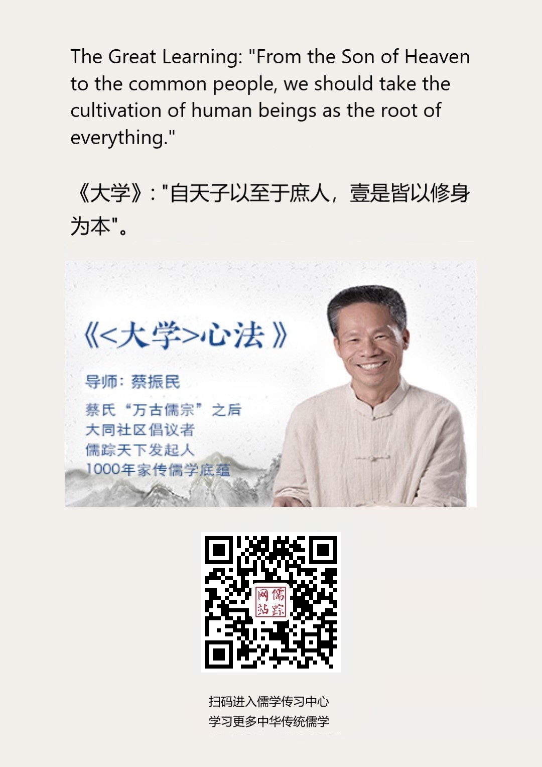 Confucianism English 92 | 《大学》: "自天子以至于庶人,壹是皆以修身为本"。