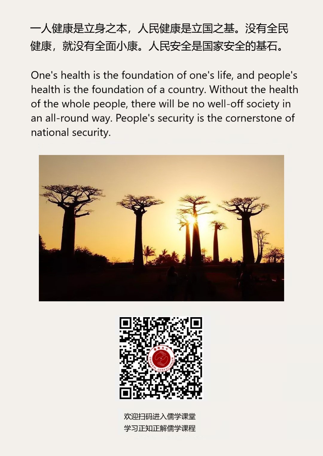 Confucianism English 193 | 一人健康是立身之本,人民健康是立国之基。没有全民健康,就没有全面小康。人民安全是国家安全的基石。