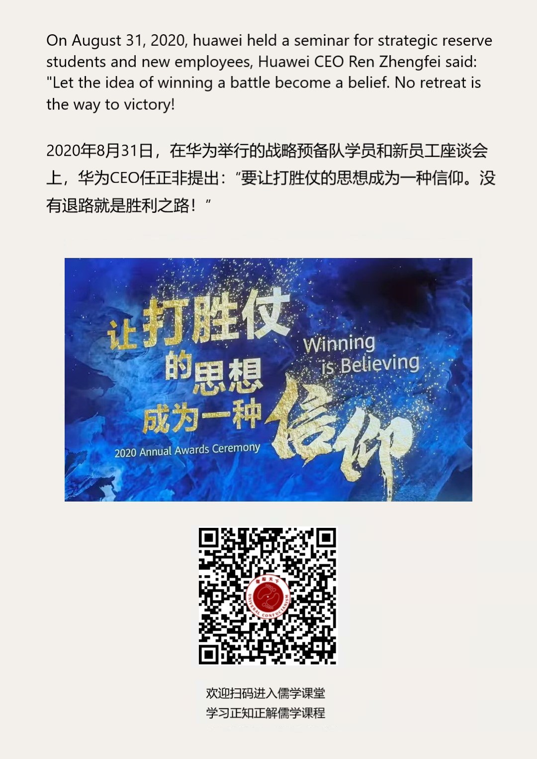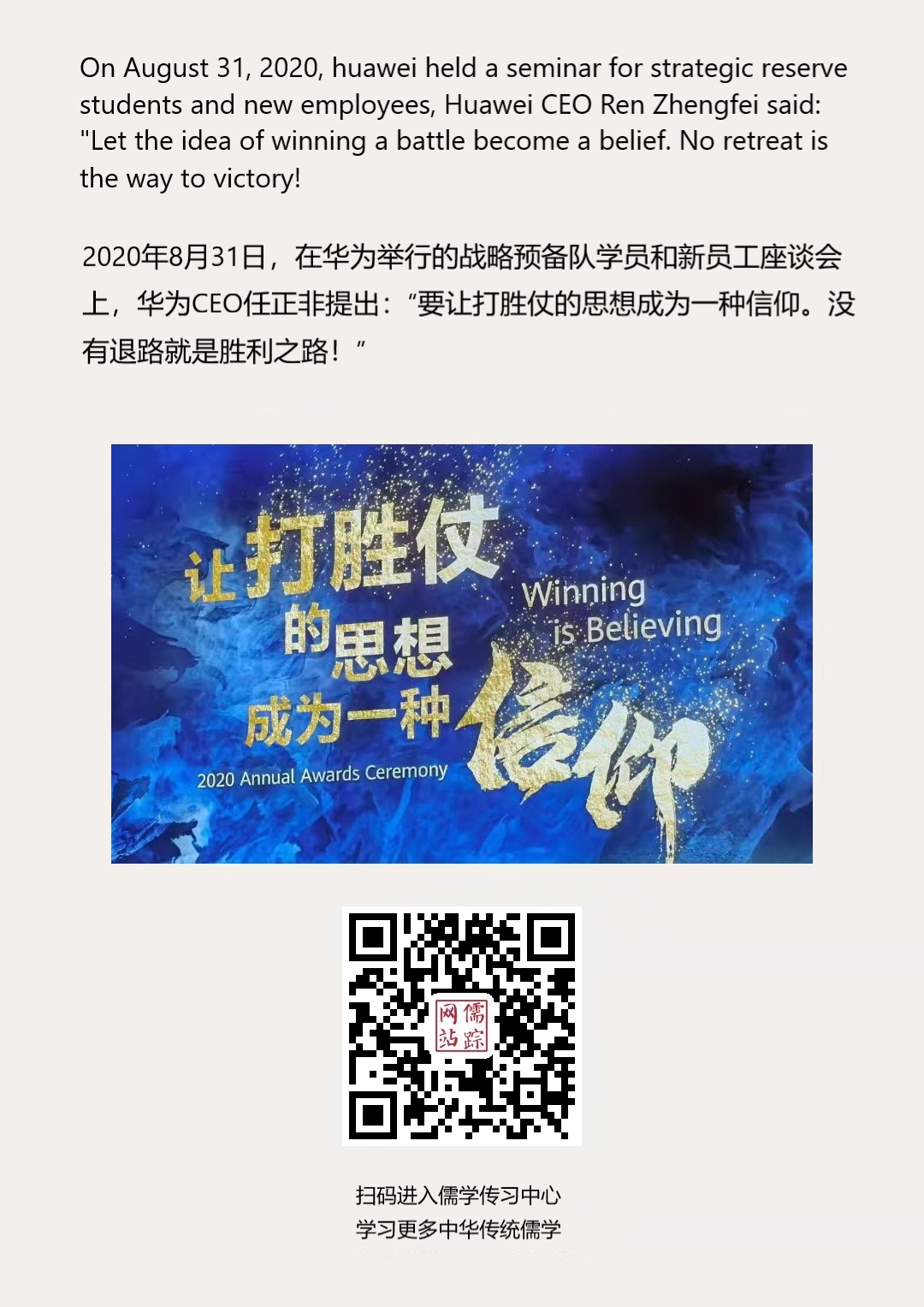 Confucianism English 195 | 华为任正非:“要让打胜仗的思想成为一种信仰。没有退路就是胜利之路!”
