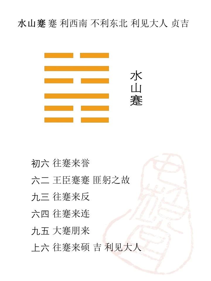 卦辭:蹇,利西南,不利東北。利見大人。貞吉。