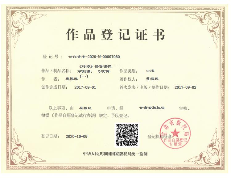 恭喜儒踪天下蔡振民老师的“《论语》语音课程” 获得国家版权证书!